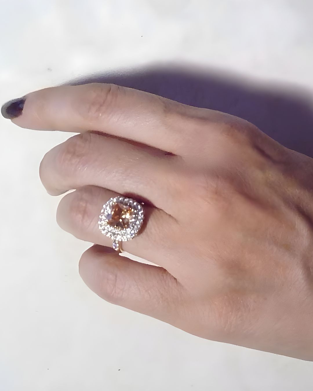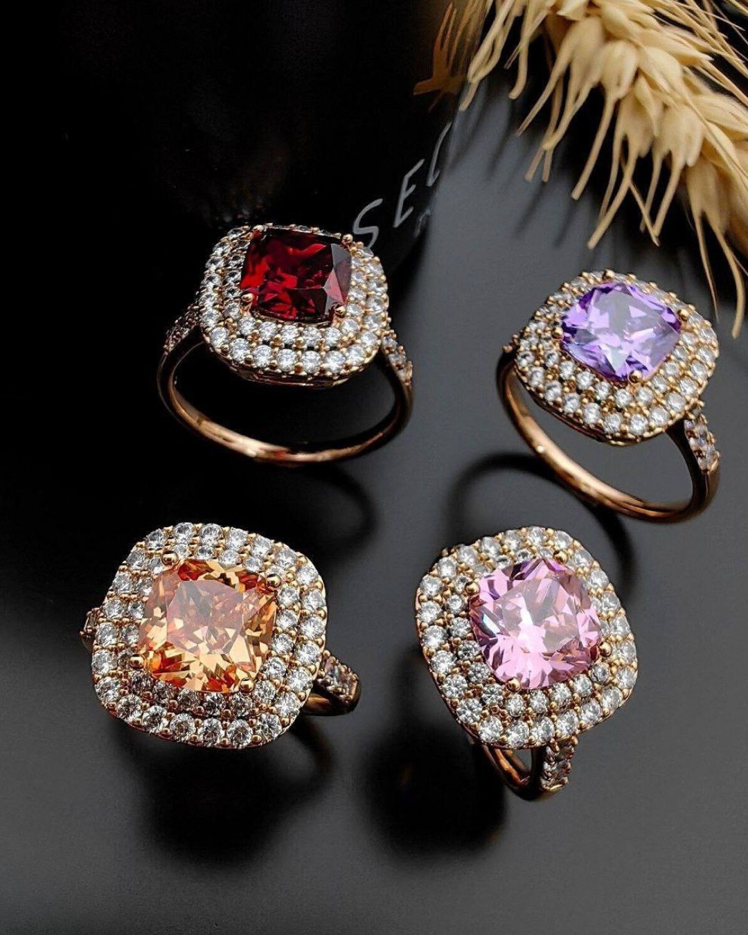 • انگشتر زنانه طلایی به شکل مربع با نگین تراش دار درشت رنگی از سواروسکی وتزیین نگین های زیرکونیا برند ژوپینگ در نوروژ اکسسوری