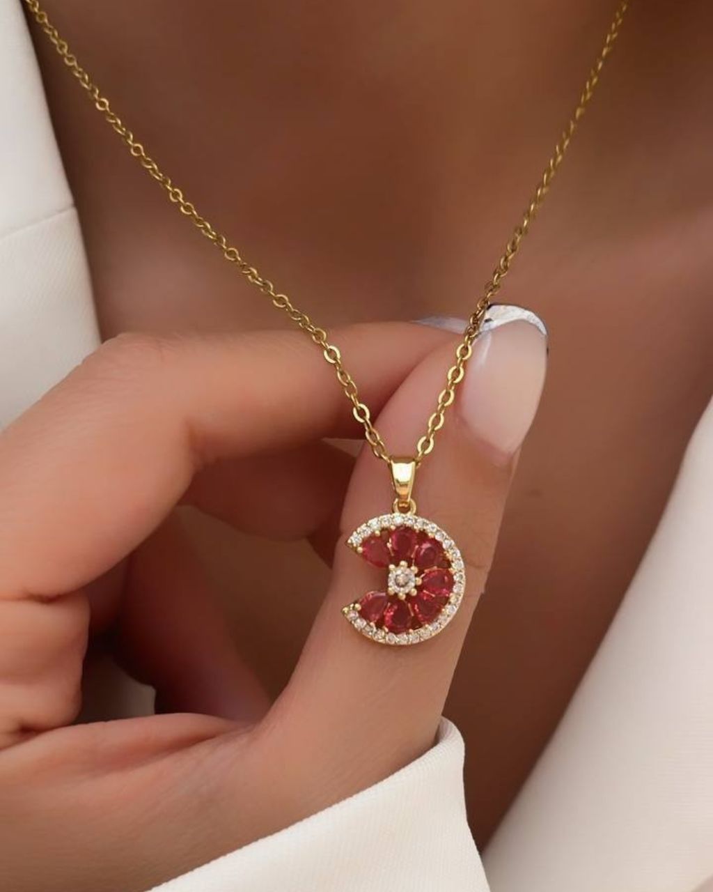 گردنبند زنانه طلایی با آویز تمام نگین پرتقال با سنگهای قرمز سواروسکی برند ترک در نوروژ اکسسوری