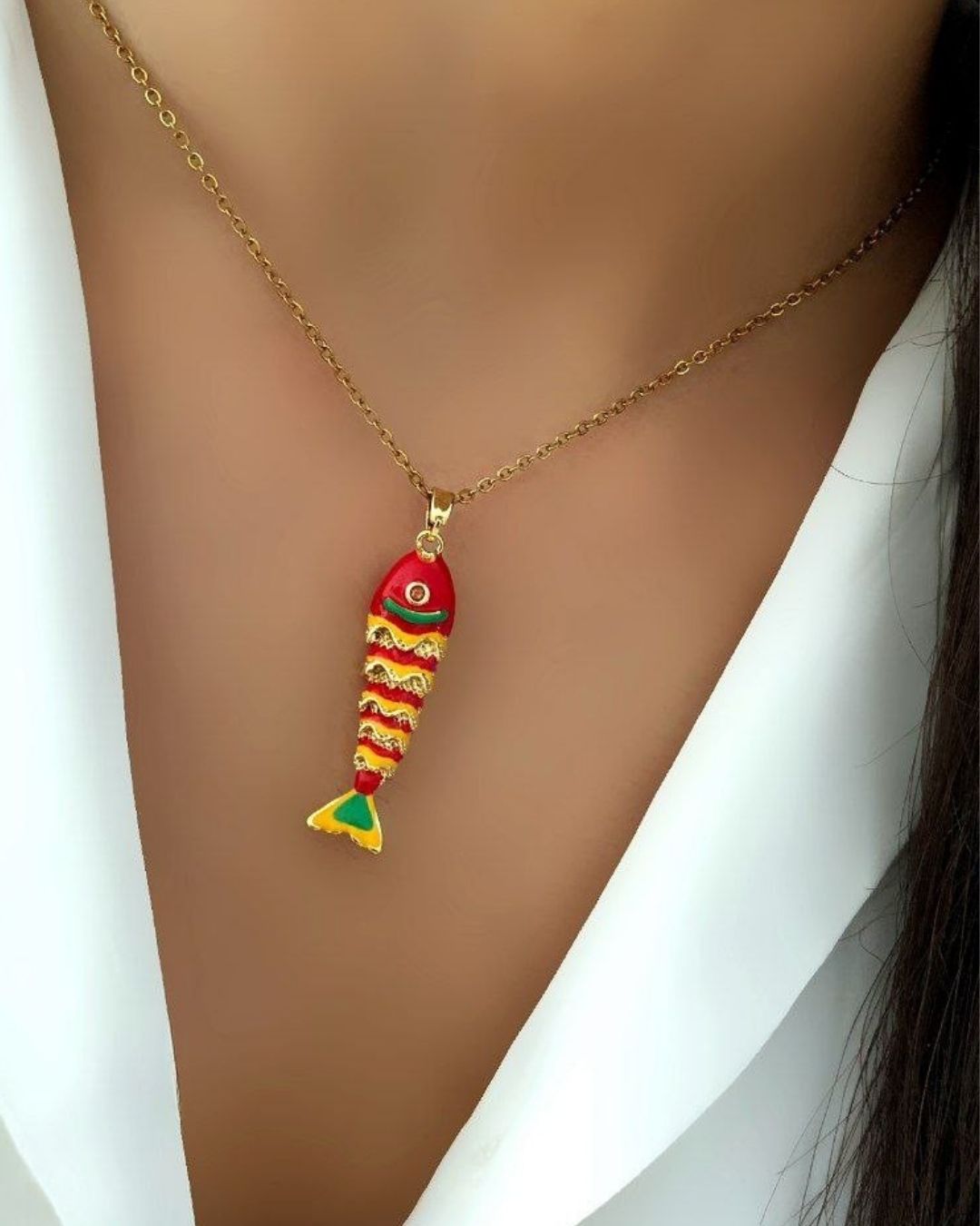 گردنبند زنانه مینا کاری طلایی با آویز ماهی قرمز زرد طلایی سبز در نوروژ اکسسوری