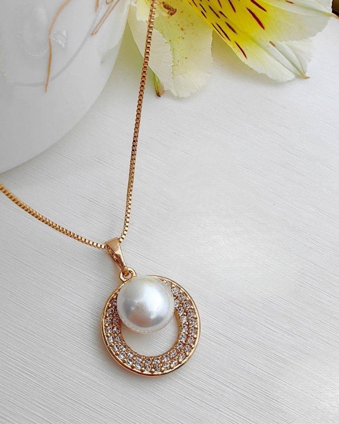 گردنبند مروارید زنانه ژوپینگ باآویز رینگ طلایی نگین دارسواروسکی و مرواریددرشت سفیدپرورشی در نوروژ اکسسوری