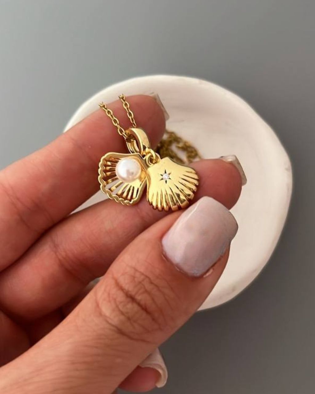 گردنبند زنانه لاکت طلایی با آویز فانتزی صدف ومروارید درون آن در نوروژ اکسسوری