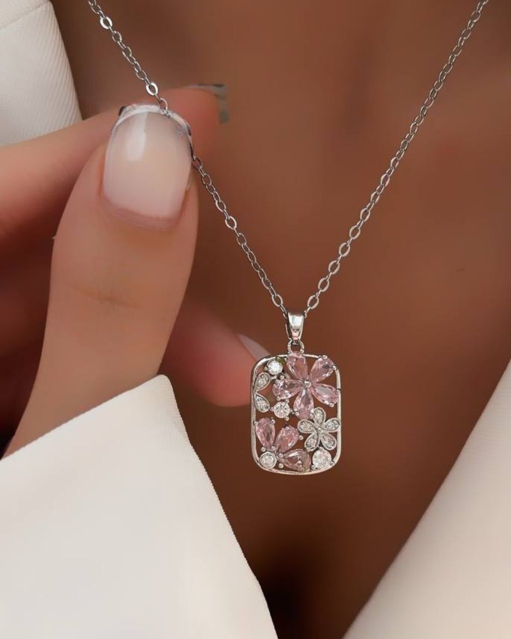 گردنبند زنانه با آویز مستطیلی و گلهای سفید و صورتی ساخته شده از نگین های سواروسکی زنجیروقاب سفید برند ترک در نوروژ اکسسوری